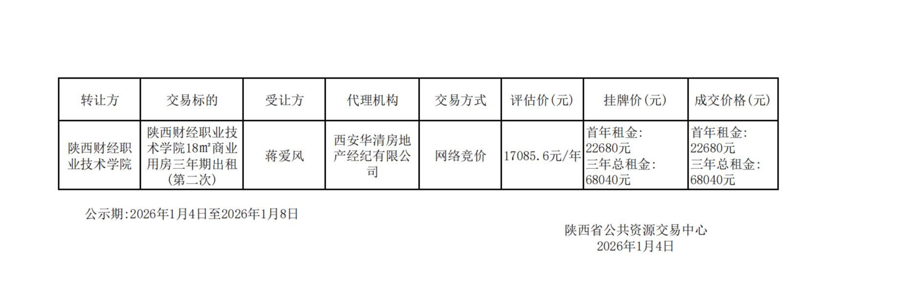 陕西财经职业技术学院18㎡商业用房三年期出租(第二次)成交公告